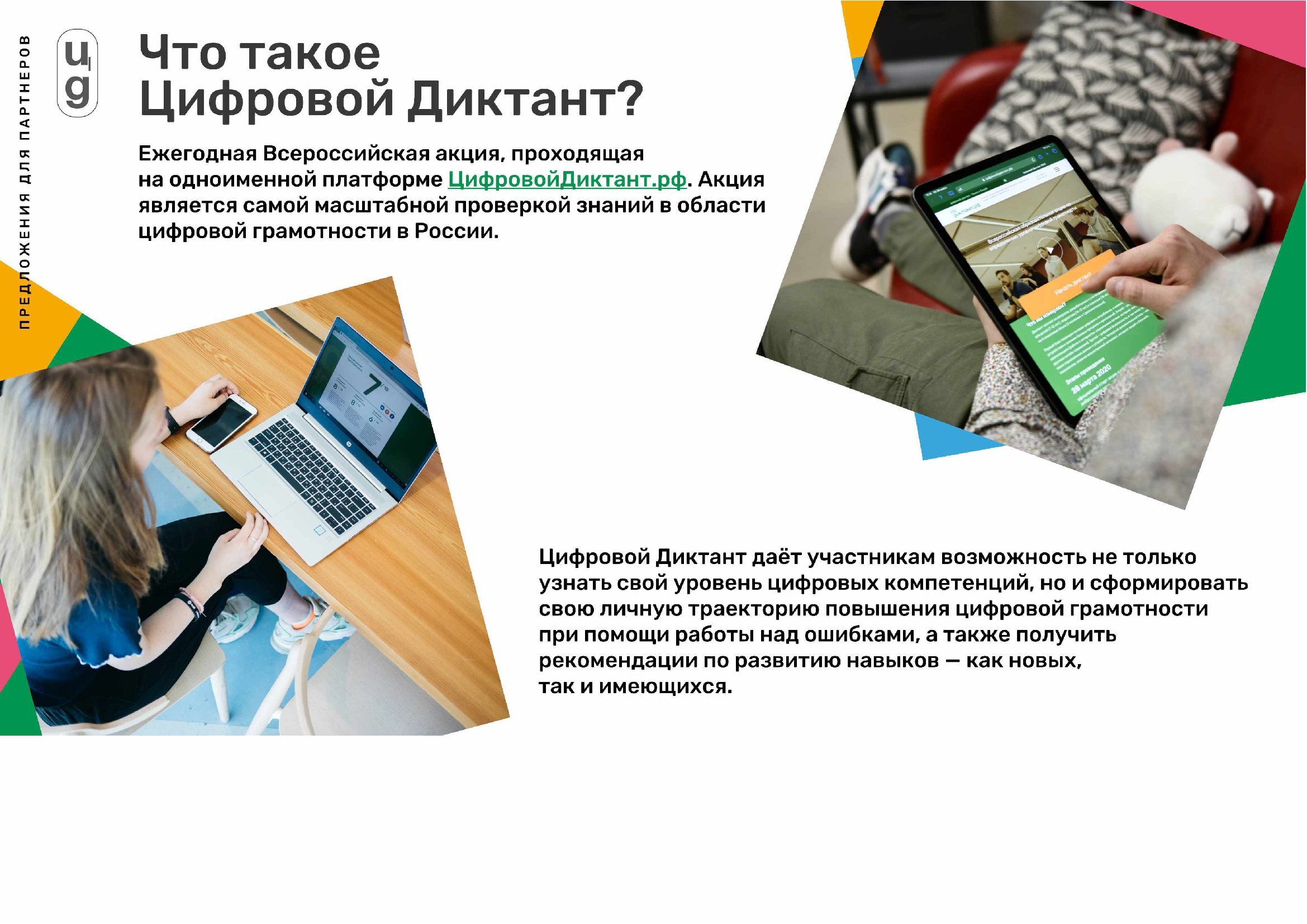 Цифровой Диктант — Всероссийская акция, признанная самой масштабной в России проверкой знаний в области цифровой грамотности. Акция дает возможность пользователям не только узнать свой уровень цифровых компетенций, но и пройти работу над ошибками, а также сформировать свою личную стратегию развития недостающих знаний и навыков.