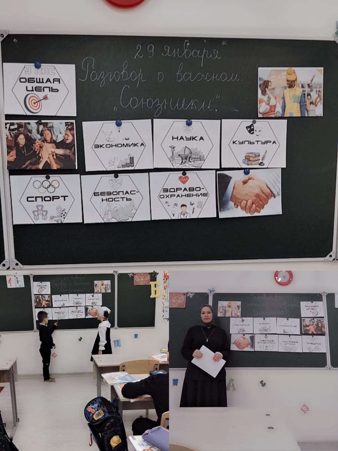 29.01.2024г. было проведено внеурочное занятие на тему: «Союзники», в котором школьники обсуждали понятие союзников, их значения в жизни человека, их роль в истории и современном мире. Учащиеся активно участвовали в дискуссии, выражали свои мнения и делились личными историями. В результате занятия у школьников сформировалось более глубокое понимание темы их важность в современном обществе.