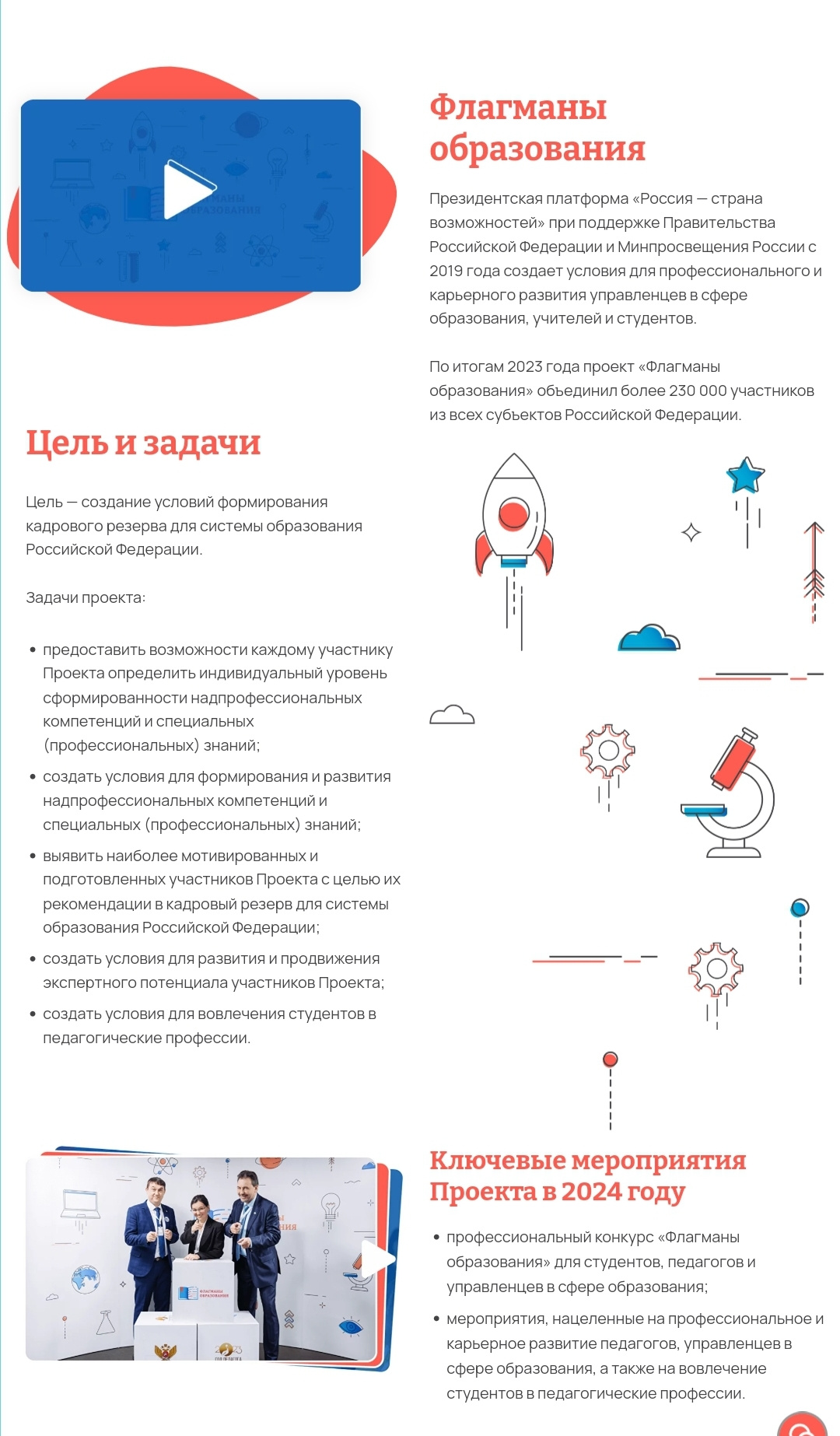 ПРОДОЛЖАЕТСЯ ПРИЕМ ЗАЯВОК НА УЧАСТИЕ В НОВОМ СЕЗОНЕ КОНКУРСА «ФЛАГМАНЫ ОБРАЗОВАНИЯ» ПРЕЗИДЕНТСКОЙ ПЛАТФОРМЫ «РОССИЯ – СТРАНА ВОЗМОЖНОСТЕЙ» Минпросвещения России совместно с АНО «Россия- страна возможностей» продолжает реализацию в 2024 году проекта «Флагманы образования». Ключевыми мероприятиями проекта являются профессиональный конкурс «Флагманы образования» и мероприятия, направленные на профессиональное и карьерное развитие педагогов и управленцев в сфере образования, а также вовлечение студентов в педагогические профессии. Финалисты и победители из числа педагогов и управленцев-участников профессионального конкурса 2023 года получили профессиональное и карьерное развитие. Из 258 финалистов 26 чел. (10%) получили повышение, а также назначения на управленческие должности, 36 чел. (14%) вошли в кадровый резерв руководителей региональной или муниципальной системы образования. При содействии Минпросвещения России 10 финалистов (4%) рассматриваются на вакантные должности в сфере образования Донецкой и Луганской народных республик, Запорожской и Херсонской областей. Из числа финалистов прошлых лет АНО «Россия – страна возможностей» сформировала экспертное сообщество «Созвездие Флагманов образования». В состав экспертного сообщества входят 189 специалистов общего, профессионального и дополнительного образования детей из 46 субъектов Российской Федерации. Участвуйте в конкурсе! Регистрация до августа по ссылке (https://flagmany.rsv.ru/?utm_source=rassilka1&utm_medium=email&utm_campaign=zk2024&utm_content=rassilka&utm_term=registration