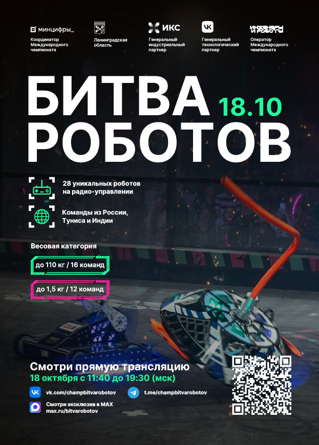 «Битва роботов» — это спортивно-технический чемпионат, на котором инженерные команды соревнуются в проектировании и сражении своих роботов. Соревнования проходят на специализированном высокотехнологичном ринге, где созданные командами роботы наносят друг другу механический урон. Время поединка составляет три минуты, а жюри оценивает степень нанесенного роботами ущерба и определяет победителя. Координацию подготовки и проведения чемпионата осуществляет Минцифры. Оператор чемпионата — АНО «Инженеры и роботы». Генеральный технологический партнёр чемпионата — VK, генеральный индустриальный партнер — «ИКС Холдинг».Более 110 команд примут участие в международном чемпионате «Битва роботов — 2025». Из 306 заявок к соревнованиям допущены 112 команд. В категории роботов весом до 110 кг выступят 64 команды, а в категории до 1,5 кг — 48 команд.